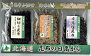 日高地域で採取された『日高昆布』を使用した「塩昆布」「鮭節・日高昆布ふりかけ」「細切り昆布」の3点セットです。